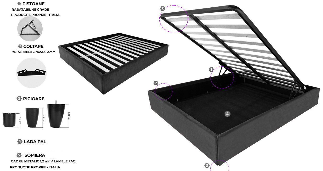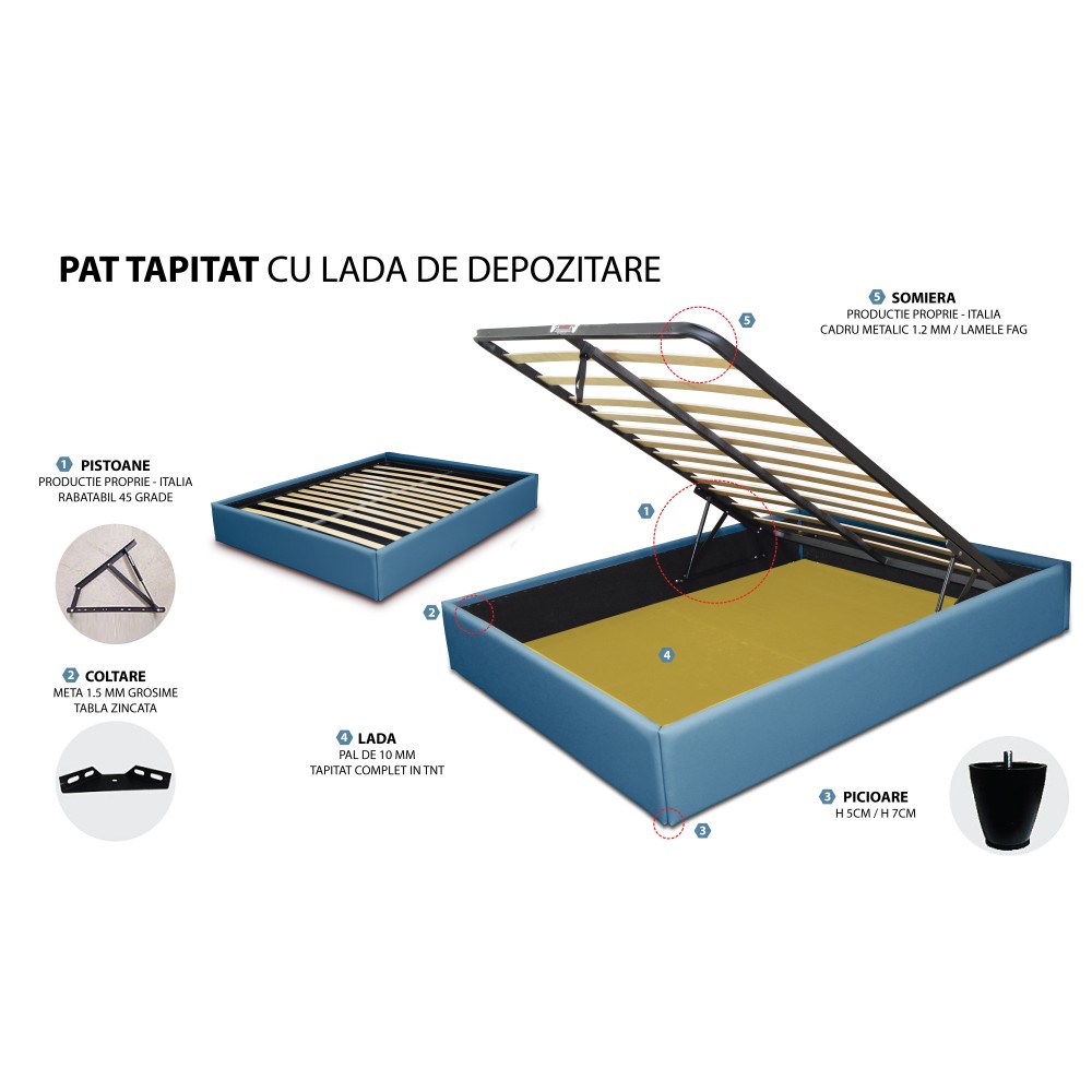 Sub eleganța designului se ascunde și un spațiu generos de depozitare, accesibil prin somiera rabatabilă cu mecanism hidraulic. Ideal pentru lenjerii, pături sau haine de sezon, acest spațiu îți oferă confort și organizare fără compromisuri.